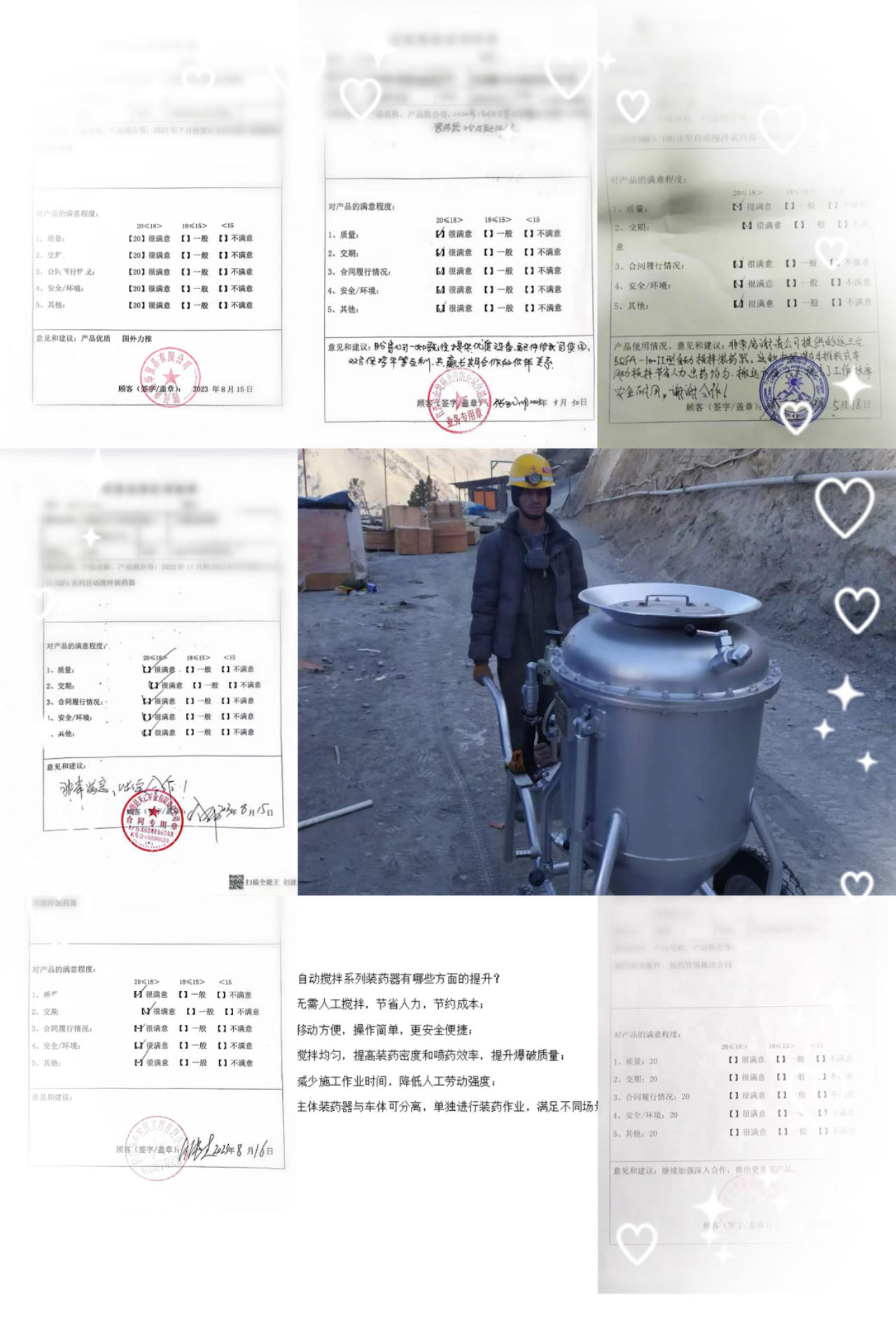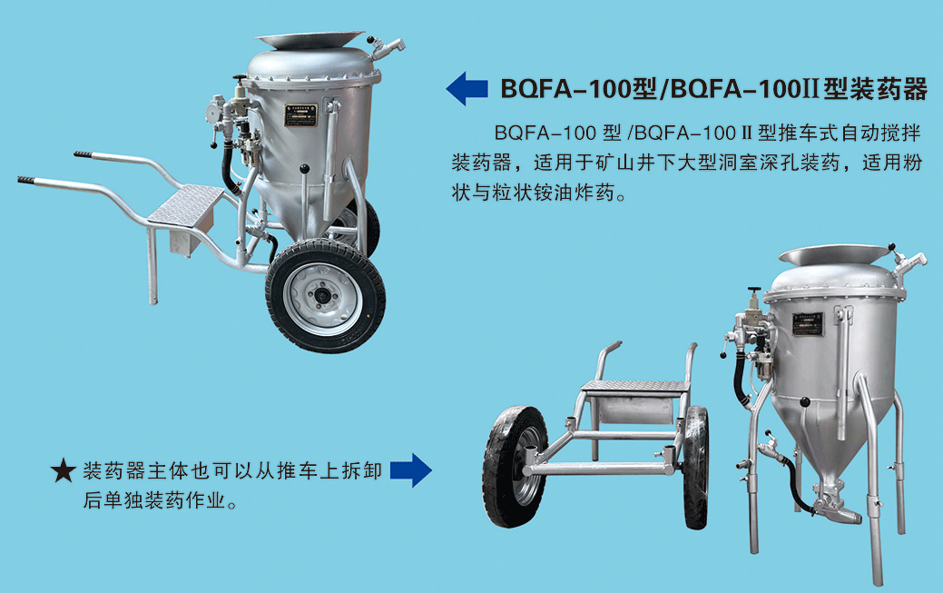 BQFA型自動攪拌系列裝藥器,與人工攪拌相比,無需人工攪拌,節(jié)省人力且攪拌均勻,移動方便,操作簡單便捷,大大降低人工勞動強度,提高裝藥密度、爆破質量,減少施工作業(yè)時間。先后出口塔吉克斯坦、老撾,秘魯,尼日利亞、法國等國家,使用情況反饋中得到一致好評并大力推薦。